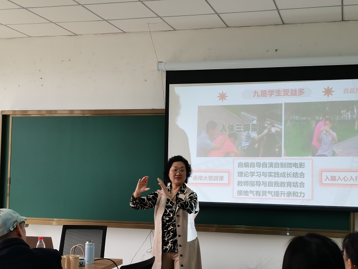 柴素芳教授首先从微电影实践教学的重要性出发,结合现实分析了“大思政课”建设时代背景,解读“大思政课”的丰富内涵,指明建设“大思政课”本质上是要围绕思政课进行改革创新,要在“大”上做文章,将思政小课堂与社会大课堂相结合。随后,柴教授结合自身及团队丰富的教学实践经验,分别从开课背景、课程目标、发展历程、解决难题、教学环节、四项要求、发展前景等方面系统讲述了如何开展思政课微电影实践教学。她强调开门办思政,要积极调动各方面社会资源,通过微电影拍摄夯实思政课的实践教学环节;最后柴教授展示了河北大学思政课微电影实践教学取得的一系列成果,其带领的团队自2013年以来,通过创新开展思政课微电影实践教学改革,指导3万多名学生拍摄微电影7000多部,取得了很好的社会反响,提升了思政课的亲和力、针对性,充分展现了“微影小切口,创新大思政”的动人魅力。