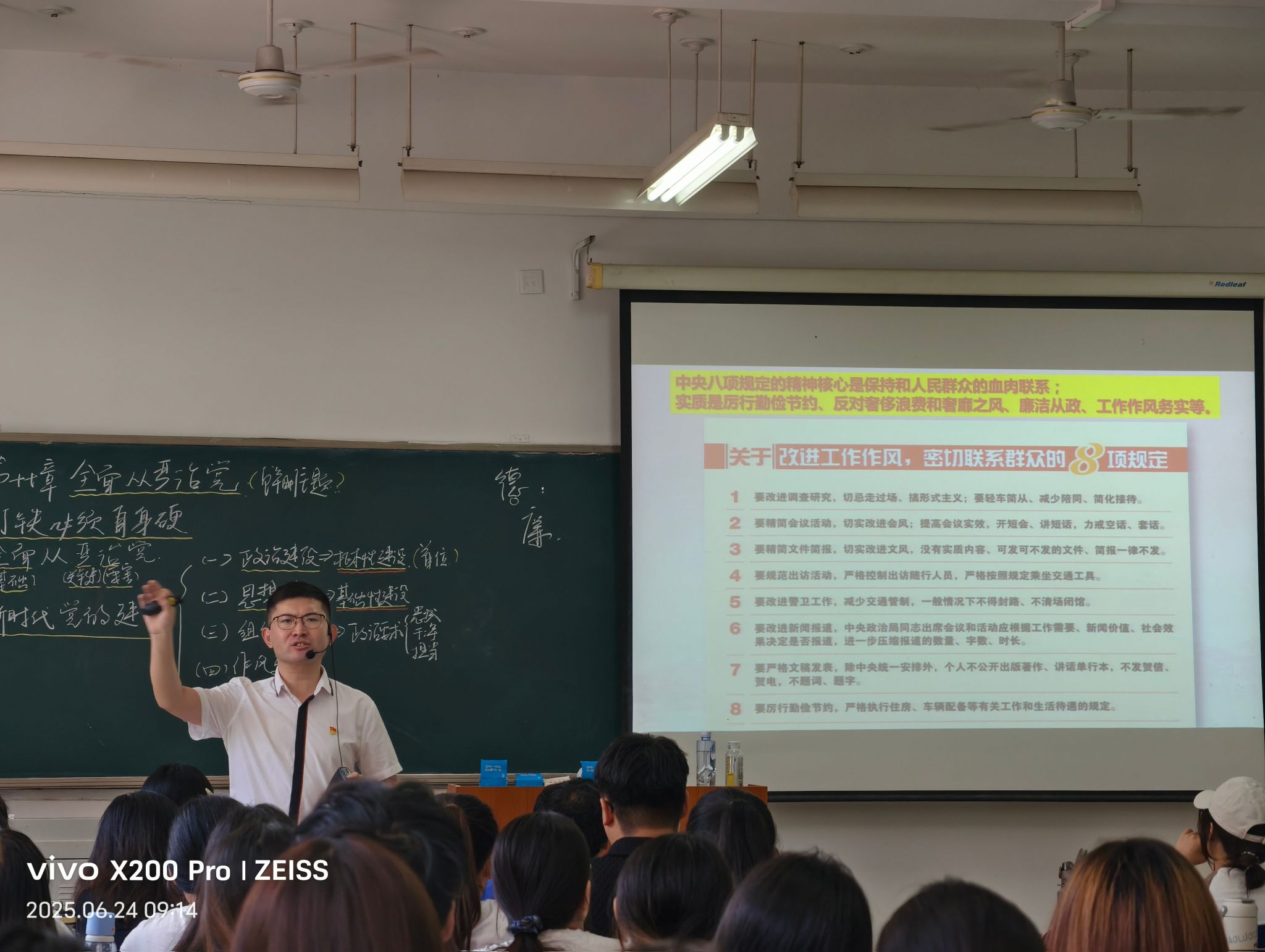 党员干部清正廉洁、造福人民的良好形象就是党的优良作风的充分彰显,在讲到新时代加强党的作风建设时,尹老师从改进调查研究、精简会议活动、规范出访活动、厉行勤俭节约等重点逐条解读了中央八项规定的具体内容,明确中央八项规定不仅是加强作风建设的纪律红线,更是政治忠诚的“试金石”。我们要锲而不舍学习并落实中央八项规定精神,推进作风建设常态化长效化。同时尹老师从“廉”字的解读到分享中国共产党人的优良传统和红色家风,强调我们要继承中华廉洁文化,明白廉为政本、持廉守正,继承并发扬党的优良作风,让廉洁文化浸润人心,让学生切实认识到清廉事关自身成长,要时刻克己慎为,将廉洁文化根植于每个人的心中。之后,尹老师讲解了加强党的纪律建设和制度建设,强调要时刻绷紧纪律规矩这根弦,并完善制度保障。